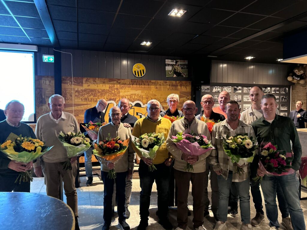 Traditioneel besteden we in de najaars ALV aandacht aan jubilarissen van onze vereniging. Dit keer maar liefst 23 jubilarissen. De mijlpaal van aantal jaren lidmaatschap van deze jubilarissen varieerden van 25 jaar (11 maal), 40 jaar (4 maal), 50 jaar (4 maal) en 60 jaar (2 maal) en zelfs 70 jaar (1 maal) en 75 jaar (1 maal). Hieronder ziet u een foto van de jubilarissen die gisteren aanwezig waren en naast een bos bloemen ook het traditionele speldje in ontvangst mochten nemen.