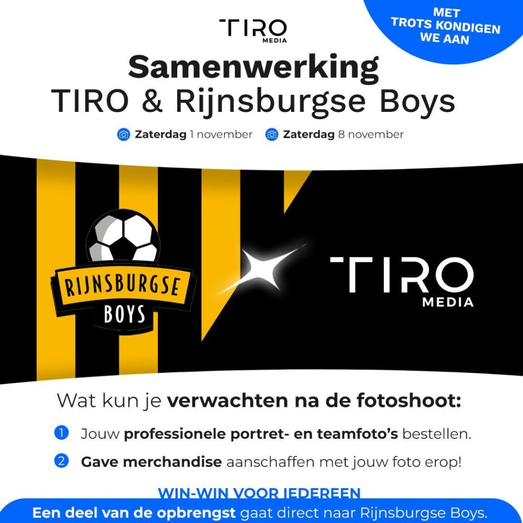 Met trots willen wij jullie informeren dat Rijnsburgse Boys met ingang van dit seizoen een samenwerking is aangegaan met TIRO Media. TIRO Media is een professioneel bedrijf gespecialiseerd in het maken van hoge kwaliteit portret- en teamfoto’s.