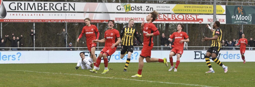 In de 77e minuut viel vervolgens, zoals eigenlijk al een beetje in de lucht hing, de aansluitingstreffer voor Jong Almere City. Daarna werd het voor Rijnsburgse Boys vooral overleven. De ploeg wist dat het de grip op de wedstrijd niet meer zou terugkrijgen en moest de voorsprong simpelweg vasthouden. Het werd daardoor nog spannend, terwijl er voor rust weinig aan de hand leek. Tegelijkertijd wist de ploeg uit Almere niet veel echt grote kansen te creëren. Na dertien zenuwslopende minuten en wat blessuretijd klonk uiteindelijk het verlossende fluitsignaal: Rijnsburgse Boys wint met 2-1 van Jong Almere City.