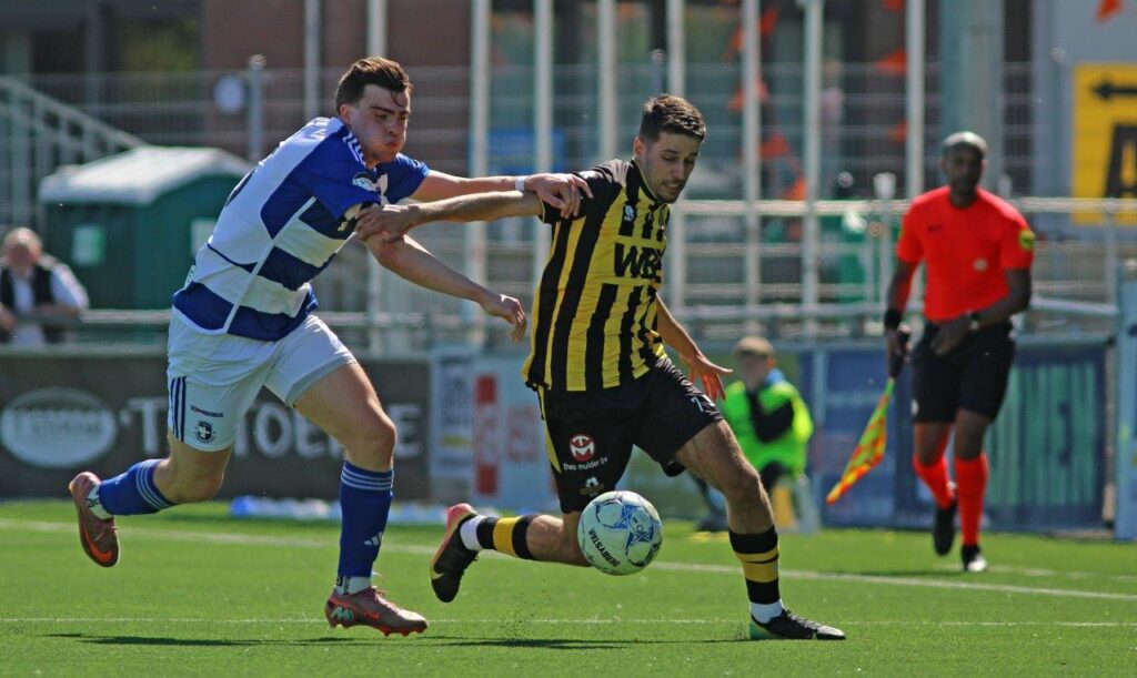 Na een wedstrijd met meerdere gezichten heeft Rijnsburgse Boys definitief afscheid moeten nemen van de kampioensdroom. Dat zowel Spakenburg als Rijnsburgse Boys voor hun laatste – theoretische – kans vochten, was duidelijk zichtbaar in de eerste helft. Met een hoge intensiteit werd vol passie gevoetbald – en ook fouten gemaakt – waarbij zich een open wedstrijd ontspon waarin Rijnsburgse Boys al vroeg op voorsprong kwam. Slecht Rijnsburgs verdedigen bracht Spakenburg binnen een half uur op voorsprong. Een terechte rode kaart voor Spakenburg, vlak voor rust, bepaalde vervolgens de tweede helft. De wedstrijd viel feitelijk stil en verpeste de klassieker. Rijnsburgse Boys bleek machteloos in het creëren van kansen terwijl Spakenburg niet alleen de voorsprong eenvoudig wist te verdedigen maar zelfs kon uitbouwen. Nadat Nino Klaver in de laatste minuut op fabuleuze wijze de 3-2 had gescoord volgde een spannende slotfase waarin Spakenburg leek te wankelen maar toch stand hield.
