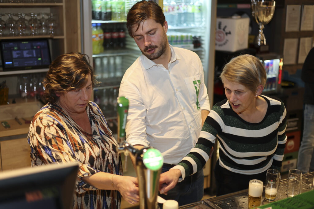 We begonnen met een oefenronde. Tijdens deze ronde was er volop ruimte voor tips van Jelle. De kwaliteit varieerde sterk. Routiniers als Tibbe en Wilfred, en onze benjamin Maurice, tapten al nagenoeg perfecte biertjes. Voor anderen bleek het toch wat lastiger. Sommige glazen deden eerder denken aan een glas melk dan aan een biertje. Dat betekende: extra lang doorpraten met de ‘klant’ terwijl de schuimkraag langzaam tot acceptabele hoogte zakte. Werk aan de winkel!