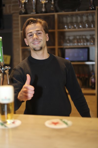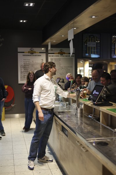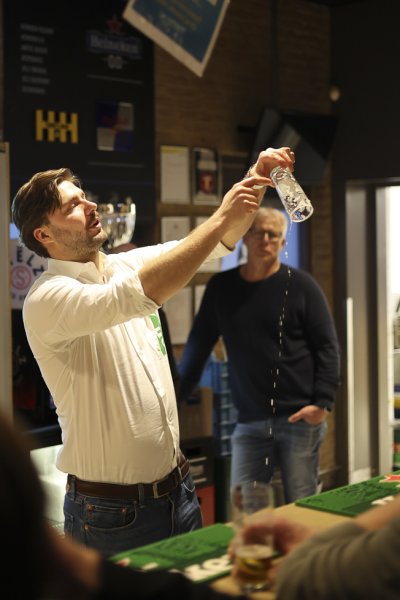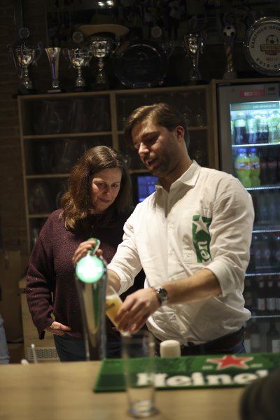We begonnen met een oefenronde. Tijdens deze ronde was er volop ruimte voor tips van Jelle. De kwaliteit varieerde sterk. Routiniers als Tibbe en Wilfred, en onze benjamin Maurice, tapten al nagenoeg perfecte biertjes. Voor anderen bleek het toch wat lastiger. Sommige glazen deden eerder denken aan een glas melk dan aan een biertje. Dat betekende: extra lang doorpraten met de ‘klant’ terwijl de schuimkraag langzaam tot acceptabele hoogte zakte. Werk aan de winkel!