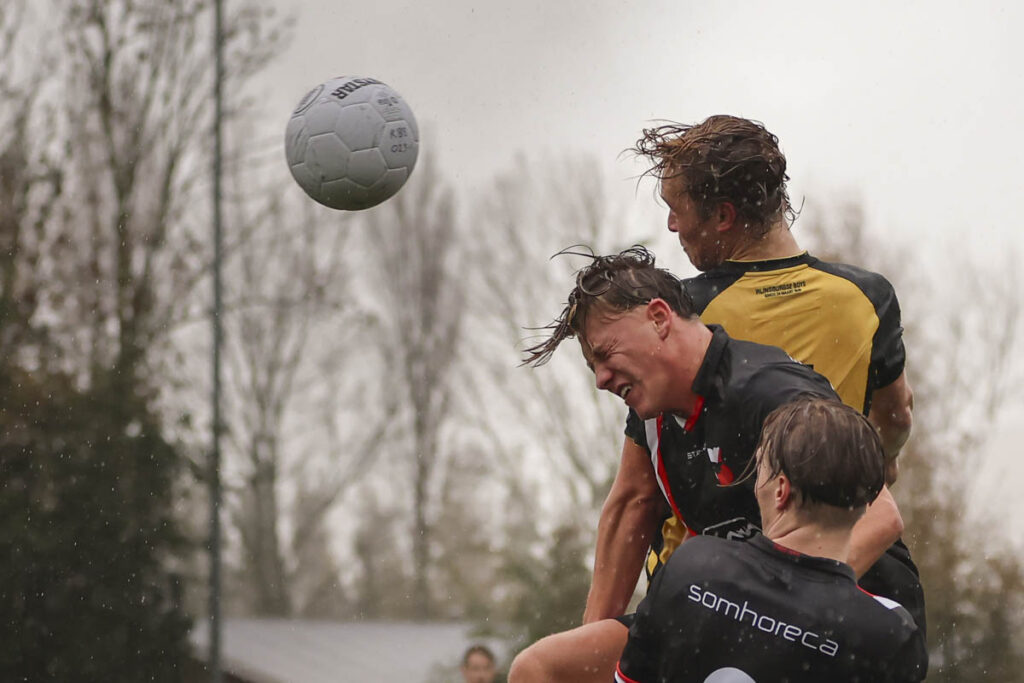 Intussen bleef het water uit de hemel vallen, maar het spelbeeld hetzelfde. We hadden de wind in de rug, maar bij een hoge bal van achteruit van HBS verkeek Dominic zich op de bal. En in één keer kon hun spits vanaf de middenlijn alleen op keeper Bryan afgaan. Die redde in eerste instantie prima, maar was kansloos bij de rebound. Vanuit het niets was het 1-1 en konden we weer opnieuw beginnen. Dat was een flinke domper, die helaas gevolgd werd door nog een grote tegenslag. Bryan verkeek zich op een diepe bal, die in één keer over hem heen zeilde. En daarmee was het nog niet gedaan voor de rust, want uit een corner tegen viel ook nog de 1-3.