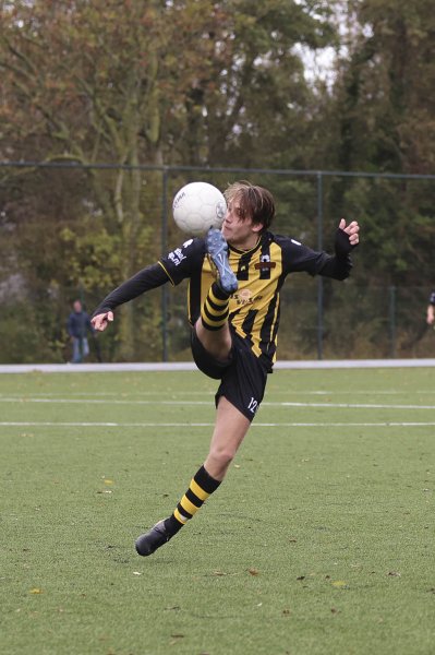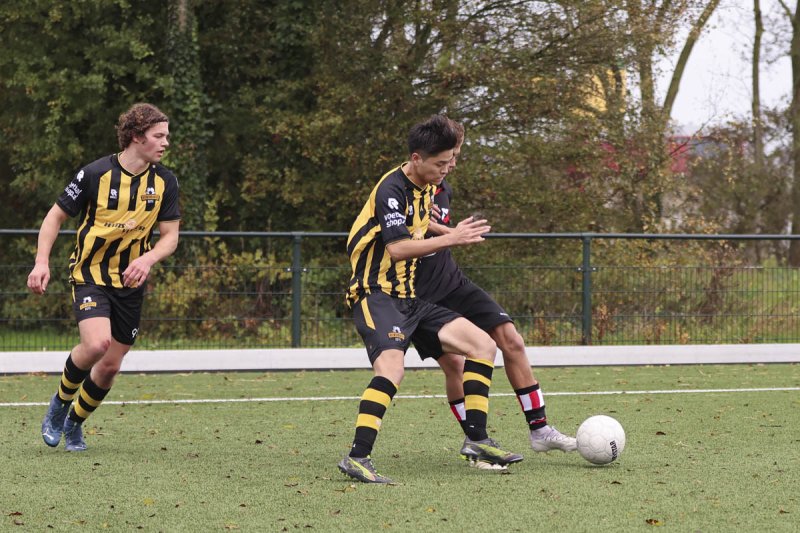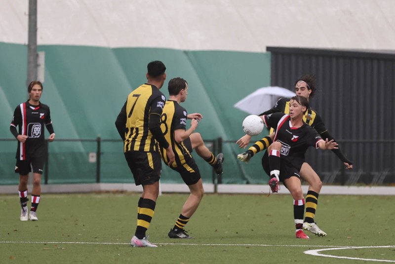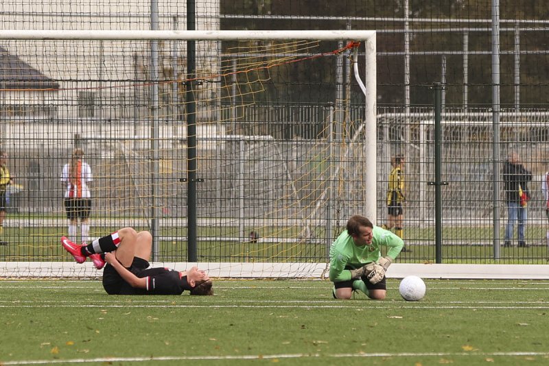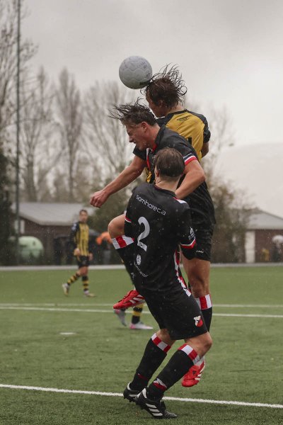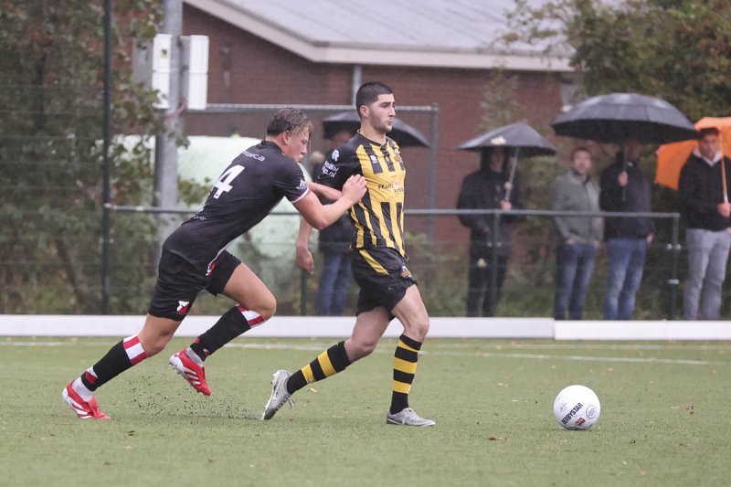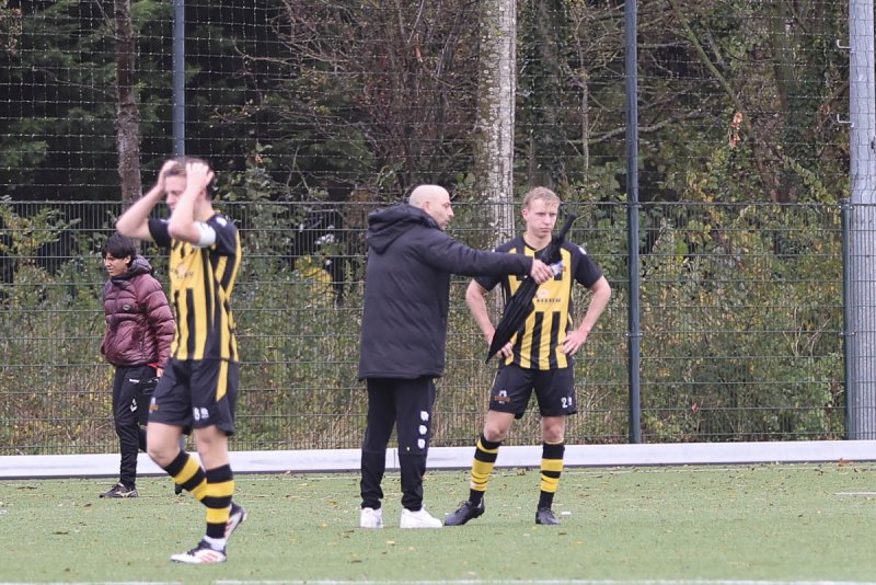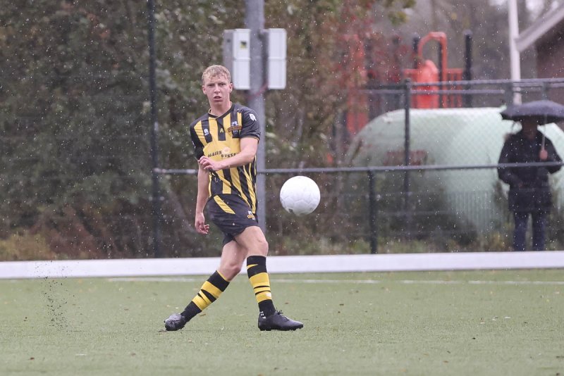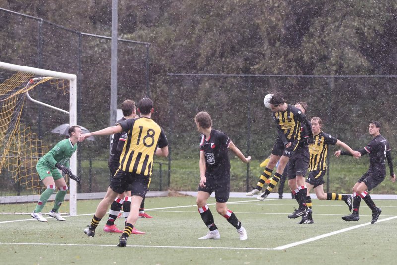 Intussen bleef het water uit de hemel vallen, maar het spelbeeld hetzelfde. We hadden de wind in de rug, maar bij een hoge bal van achteruit van HBS verkeek Dominic zich op de bal. En in één keer kon hun spits vanaf de middenlijn alleen op keeper Bryan afgaan. Die redde in eerste instantie prima, maar was kansloos bij de rebound. Vanuit het niets was het 1-1 en konden we weer opnieuw beginnen. Dat was een flinke domper, die helaas gevolgd werd door nog een grote tegenslag. Bryan verkeek zich op een diepe bal, die in één keer over hem heen zeilde. En daarmee was het nog niet gedaan voor de rust, want uit een corner tegen viel ook nog de 1-3.