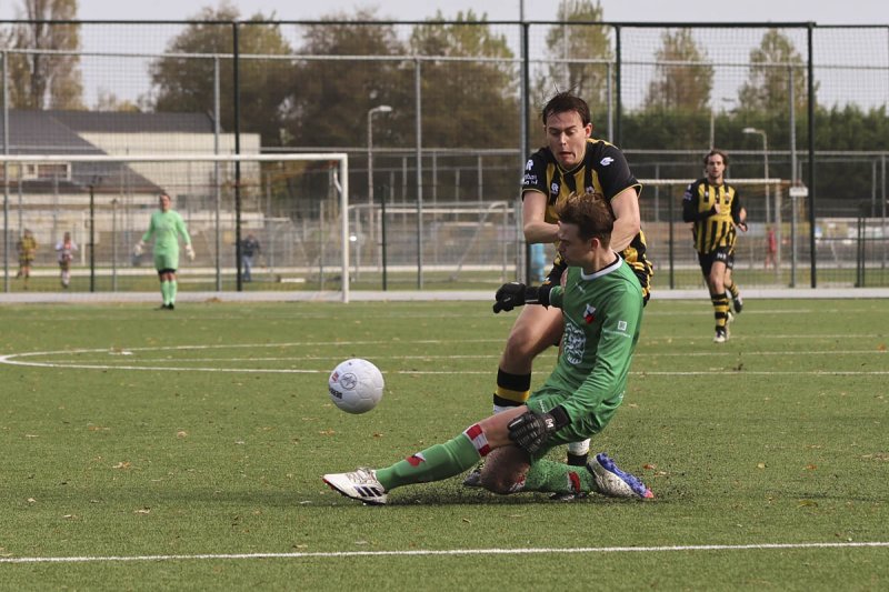 En zijn mannen kwamen uitstekend de kleedkamer uit, want bij een prima aanval over de linkerflank bediende Denzel Rutger op maat. Die had slechts twee minuten nodig om zijn doelpunt erin te prikken. De toeschouwers langs de kant gingen er goed voor staan, want kon Rijnsburg erop en erover gaan? Het regende niet meer deze tweede helft, maar het regende helaas ook geen kansen voor onze boys. Wat ze ook probeerden, ze kwamen er niet doorheen. Ruben viel nog in, Lucas ook voor een alles of niets offensief. Maar het baatte niet, het lukte niet om grote kansen te creëren laat staan doelpunten maken. En dus verloren we deze wedstrijd, waardoor we het niet meer in eigen hand hebben om kampioen te worden. Dat willen we graag, want we willen graag een niveau hoger spelen. En alleen de kampioen promoveert, dus volop werk aan de winkel. Met nog zes wedstrijden te gaan, gaan we er alles aan doen dit alsnog te bewerkstelligen!